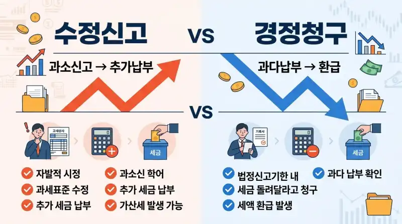 결론부터 말씀드리면, 세금을 덜 냈을 때는 ‘수정신고’, 세금을 더 냈을 때는 ‘경정청구’예요. 방향이 정반대라고 보시면 됩니다.