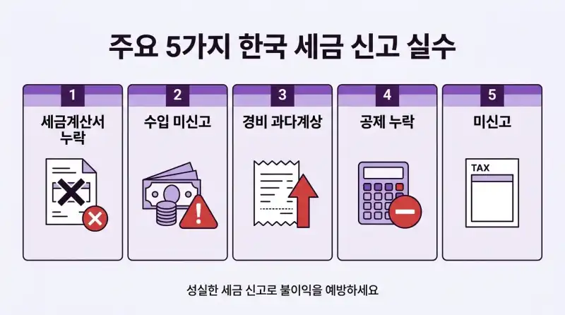 가지 흔한 세금 신고 실수 세금계산서 누락, 수입 미신고, 경비 과다계상, 공제 누락, 미신고 등을 아이콘으로 표현