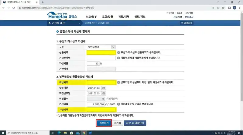 홈택스 가산세 입력 화면 가산세와 납부불성실가산세 입력 필드가 노란색으로 강조된 양식 화면