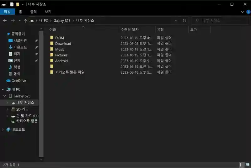 윈도우 파일 탐색기에서 스마트폰 폴더를 탐색하는 화면