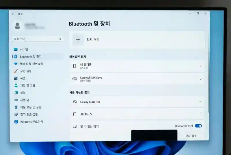 블루투스 연결 설정 화면이 표시된 윈도우 PC