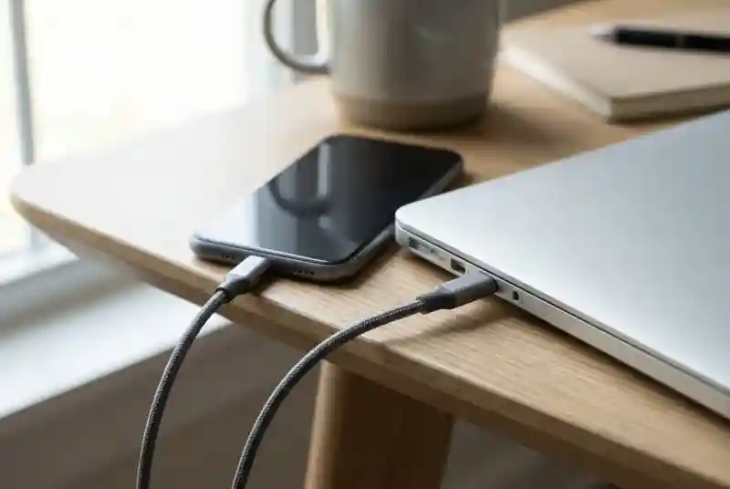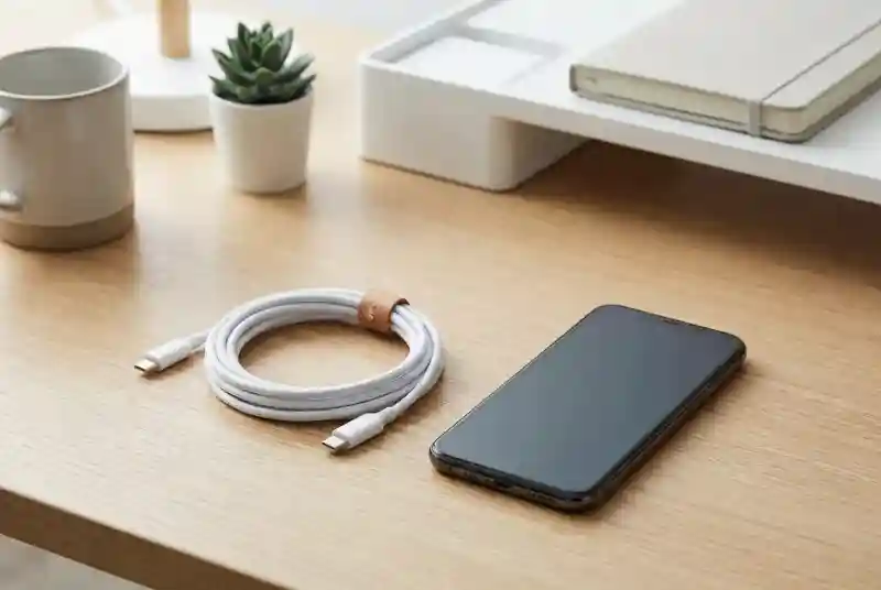 USB-C 케이블과 스마트폰이 놓인 깔끔한 책상 풍경