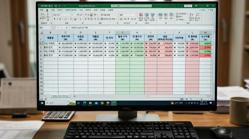여기서 ‘연간 총비용’에 들어가는 항목이 생각보다 많아요. 재산세, 관리비 중 임대인 부담분, 수선비(보일러 교체 같은 거), 공실 기간 손실, 보험료 등이 전부 포함돼요. 그리고 ‘실투자금’은 단순 매매가가 아니라 (매매가 + 취득세 + 중개수수료 + 법무비 – 보증금)으로 잡아야 정확합니다.