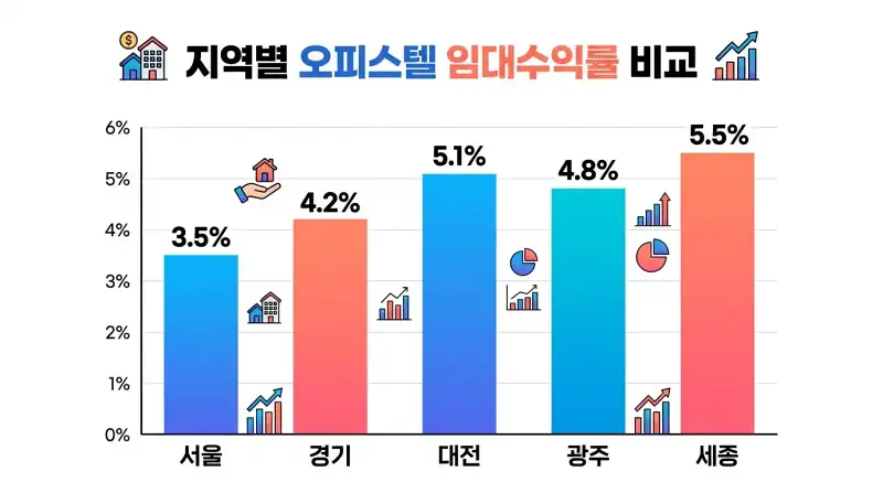 다만 2025년 2월 기준 서울 오피스텔 임대수익률은 4.87%로 전년 동월(4.73%) 대비 소폭 올랐지만, 강남구 같은 고가 지역은 3% 초반에 불과하다는 점도 기억해 두세요. 지역별 편차가 상당하기 때문에, 전국 평균만 보고 투자 결정을 내리면 안 됩니다.
